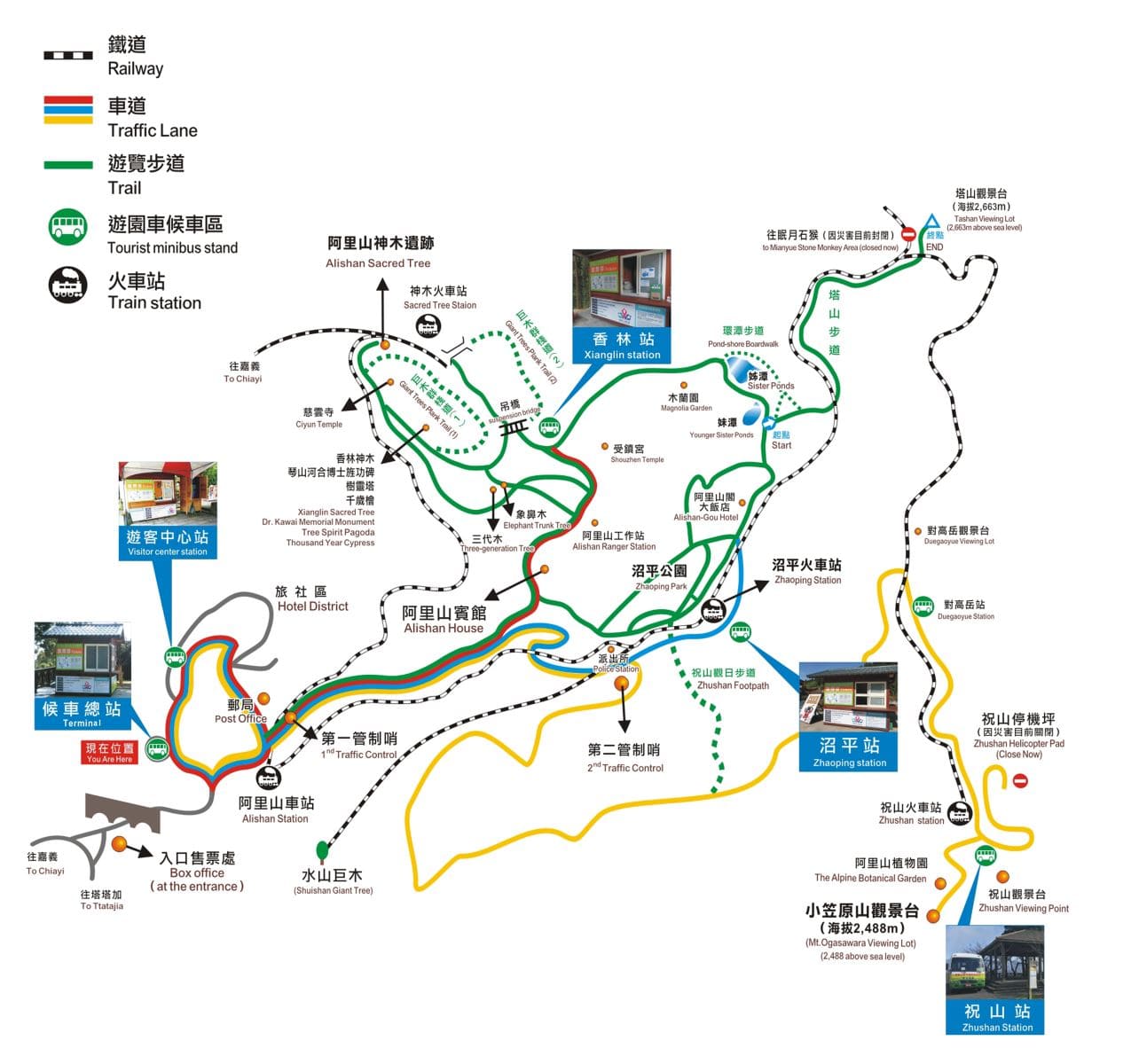 Alishan Railway Station (阿里山火車站) → Forest Trail (森之道) → Alishan Trail (阿里山步道) →Cherry Blossom Railway (櫻花鐵道) → Alishan Skywalk (天空步道) → Zhaoping Railway Station (沼平車站) → Sisters Pond (姊妹潭) → The Three Brothers (三兄弟) → The Foue Sisters (四姊妹) → Golden Pig Tree (金豬報喜) → Magnolia Garden (木蘭園) → Xianglin Service Area (香林服務區) → Shouzhen Temple (受鎮宮) → No. 28 Giant Tree (28號巨木) → Shenyi Waterfall (神怡流瀑) → Sacred Tree Remains (阿里山神木遺跡) → Sacred tree Station (神木車站) → Ciyun Temple (慈雲寺) → Sacred Tree (香林神木) → Tree Spirit Pagoda (樹靈塔) → Thousand Years Cypress (千歲檜) → Alishan Museum (阿里山博物館) → Ciyun Viewing Platform (慈雲觀景) → Xianglin Elementary School (香林國小) → Three Generations Trees (三代木) → Elephant Trunk Tree (象鼻木) → Giant Tree Plank Trail (巨木群棧道) → King Cherry (阿里山櫻王) → Boat Bridge (舟之橋) → Xianglin Arch Bridge (香林拱橋) → Alishan Visitor Center (阿里山旅客中心)