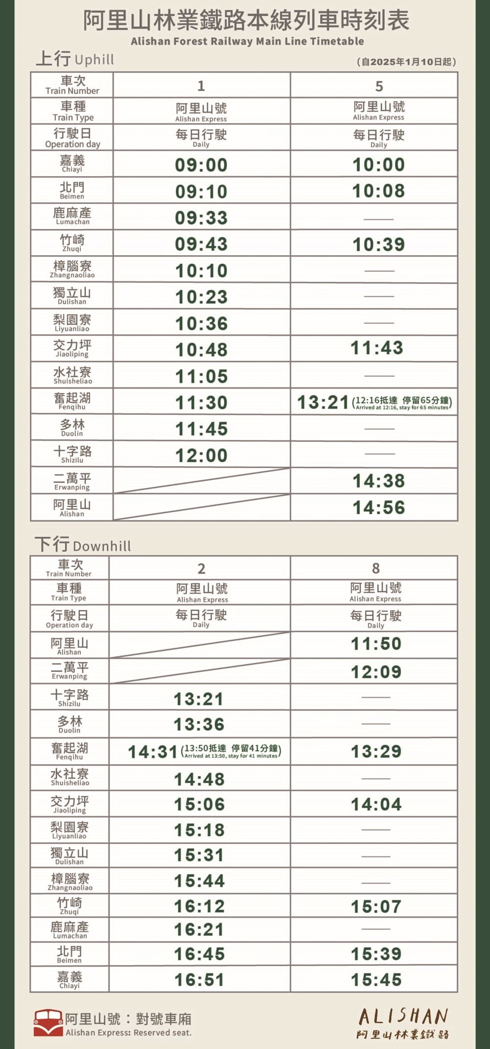Departure from Alishan: 14:00 (Weekends and Consecutive holidays)